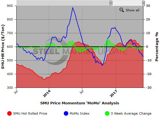 MoMo was measured at -7.57 percent this week, meaning that the current hot rolled steel price is lower than the average price over the last 12 weeks. The last time the MoMo Index was this low was the week of November 1, 2016 when it was -8.21 percent.
