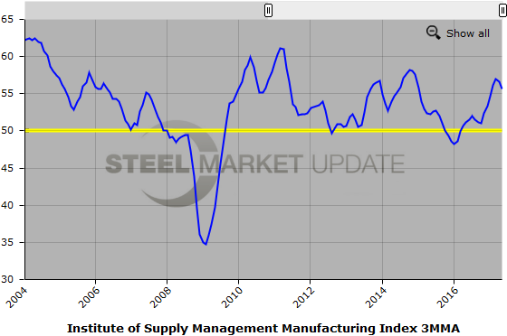 Below is a graph showing the history of the ISM Manufacturing Index. You will need to view the graph on our website to use its interactive features, you can do so by clicking here. If you need assistance logging into or navigating the website, please contact our office at 800-432-3475 or info@SteelMarketUpdate.com.