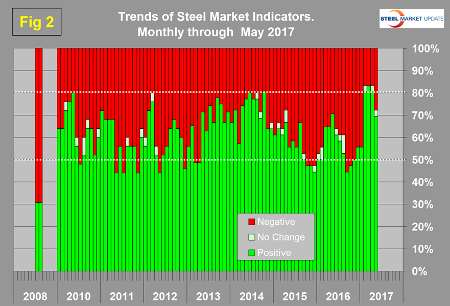 There was a net increase of two indicators that we consider to be positive in May, a decrease of two neutrals and no change in the number of negatives. We currently view 18 of the 36 indicators as positive, 11 as neutral and 7 as negative. Our intent in using the word neutral is to say that this indicator is considered to be in the mid-range of historical data. The changes this month were as follows. The Chicago Fed National Activity Index had a reading > 0.2 in May which we regard as positive. Demand for commercial and industrial loans as reported in the Federal Reserve Senior Loan Officer Survey entered negative territory. The broad index value of the US $ on international exchange markets fell below 100 which we regard as positive. In the raw materials section the price of coking coal came off its cyclone driven peak and returned to a neutral position. There were no changes in the present situation of the long products market. In the sheet market total mill shipments moved into the positive category. There were no changes to our perception of either the construction or manufacturing indicators. Figure 1 shows our monthly assessment of the present situation since January 2010 on a percentage basis.