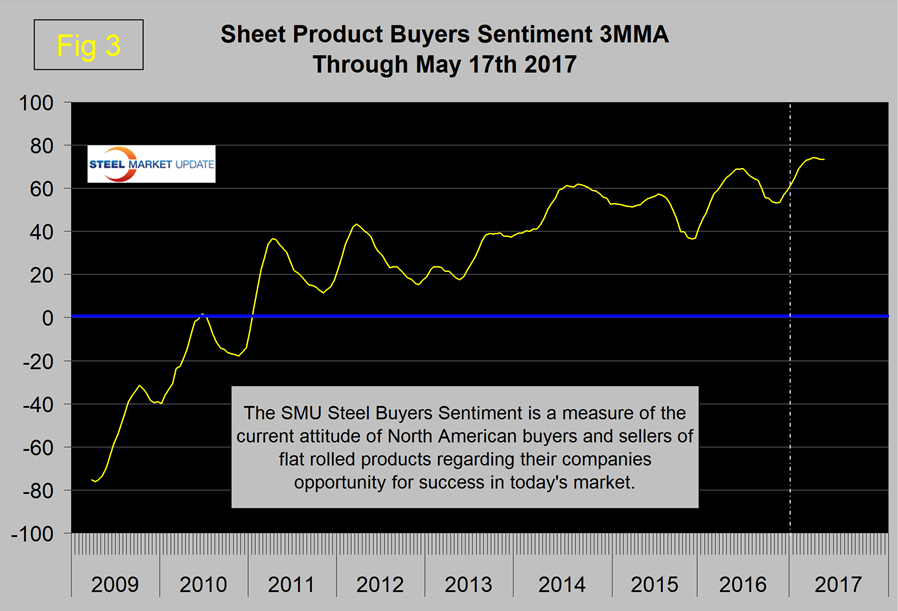 In the SMU index section the steel buyers sentiment has declined slightly from its all-time high in mid-March of 74.17 to 73.33 in mid-May (Figure 3).