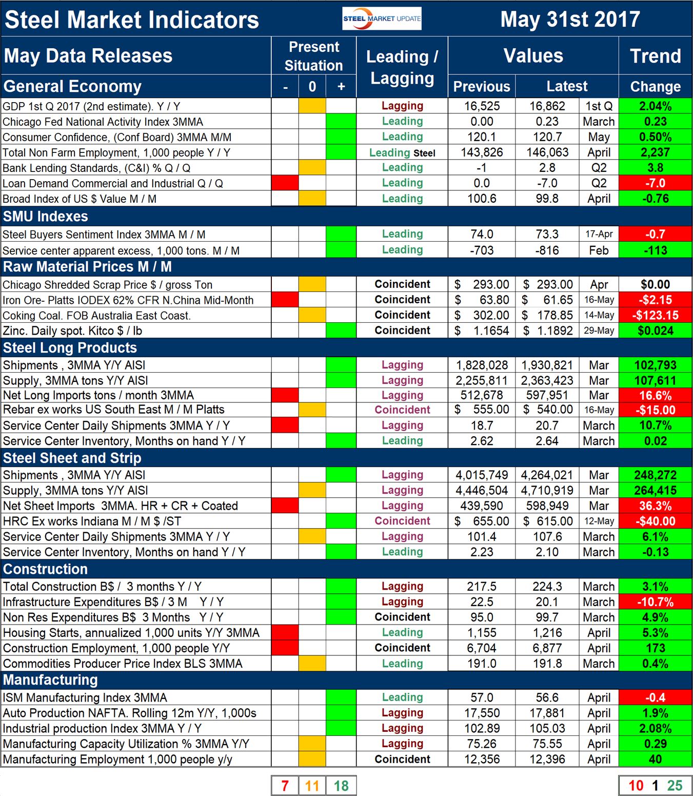 In the raw materials section the price of Chicago shredded was unchanged after declining in April. The price of iron ore continued to trend down, coking coal reversed course and trended down and zinc reversed course and trended up. We regard rising raw materials prices as positive and indicative of a strengthening market. Trends in the long product and sheet markets were the same. Both are experiencing an increase in net imports and a decrease in prices. There was no change in construction trends in May and in manufacturing the only trend reversal was in the ISM manufacturing index which declined slightly in April after a very strong surge in March.
