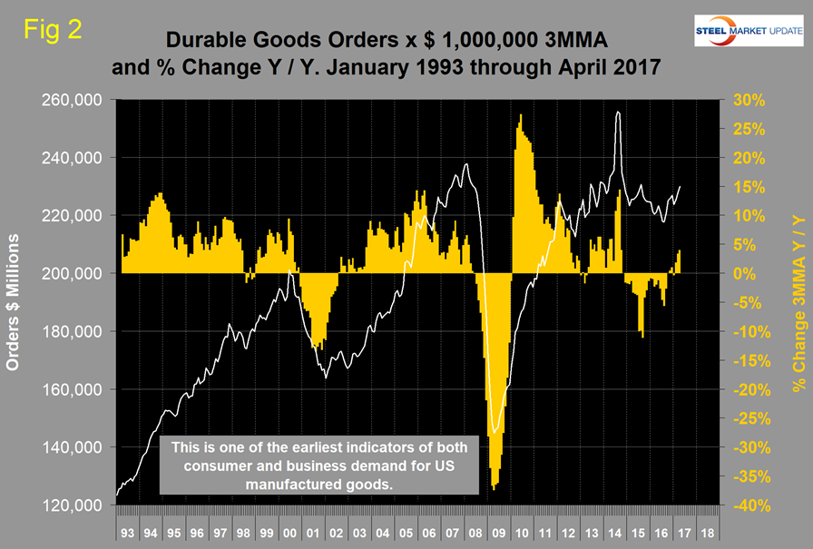 New Orders for Durable Goods: Figure 2 shows the 3MMA of monthly orders for durable goods since January 2010 with the percent change y /y.