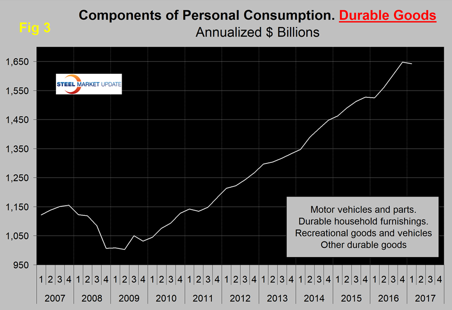 Durable goods manufactured for personal consumption have been on a healthy growth curve ever since the end of the recession with a slight blip at the end of 2015 and another in Q1 2017.