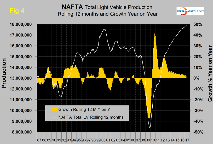 Auto Production in NAFTA was still experiencing a 1.9 percent y/y growth rate through April which considering output is at an all-time high is good (Figure 4).