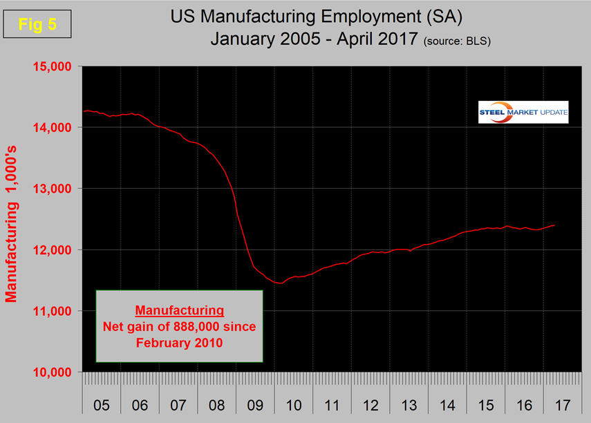 SMU Comment: On balance the various measures of the health of manufacturing are encouraging. We give the ISM index the most credence and it is also the only leading indicator of the group. Auto assemblies and its supplier industries are doing well in NFTA but the US and Canada are losing share to Mexico. Manufacturing employment has had positive growth for five months through April and the March and the April employment component of the ISM index were the highest since September 2014. The most disappointing indicator is manufacturing productivity which we would have expected to be better than reported.