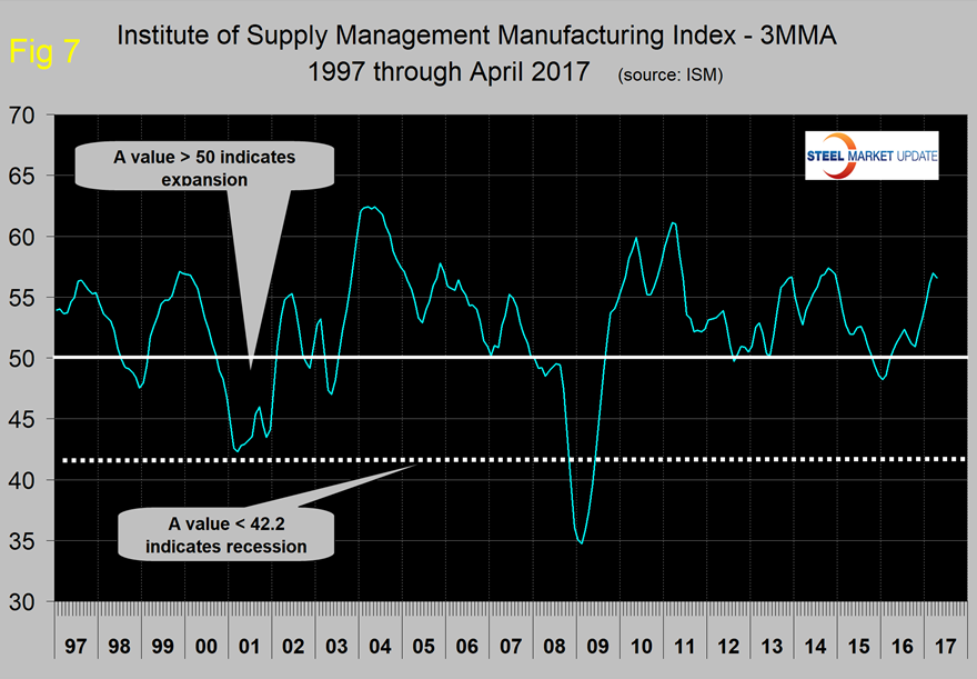 The ISM Manufacturing Index is a diffusion index. The Institute of Supply Management states that, “diffusion indexes have the properties of leading indicators and are convenient summary measures showing the prevailing direction of change and the scope of change. A PMI reading above 50 percent indicates that the manufacturing economy is generally expanding; below 50 percent indicates that it is generally declining.” Figure 7 shows the 3MMA of the ISM index from January 1997 through April 2017 with an improving trend for over a year.