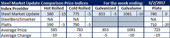 Benchmark hot rolled pricing dropped $15 per ton to an average of $580 per ton on SMU index and $5 per ton to $590 at Platts. SteelBenchmarker did not report prices this week as they only report twice per month.