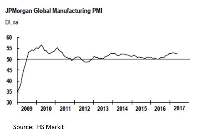 Global manufacturing was at a six month low in May according the latest JP Morgan Global Manufacturing PMI. The composite index inched down to 52.6 from 52.7 in April.