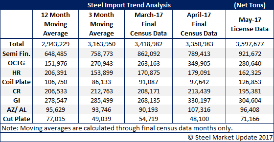 On Friday, the U.S. Department of Commerce released Final Census Data on foreign steel imports for the month of April 2017. As expected, the month was another large one with imports totaling 3,350,983 net tons. This is above both the 3-month and 12-month moving averages.