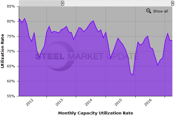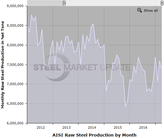 SMU Note: An interactive graphic of our raw steel production history can be seen in the Analysis section of our website here. Two condensed examples can be found below. If you need help logging into the website or navigating through it, please contact us at info@SteelMarketUpdate.com or 800-432-3475.