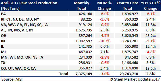 The American Iron & Steel Institute (AISI) recently reported final U.S. raw steel production estimates for the month of April 2017. The monthly estimates are different than the weekly estimates we report; the monthly estimates are based on over 75 percent of the domestic mills reporting vs. only 50 percent for the weekly estimates.