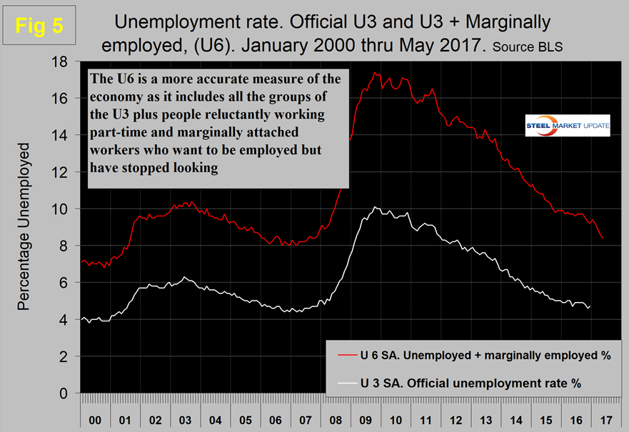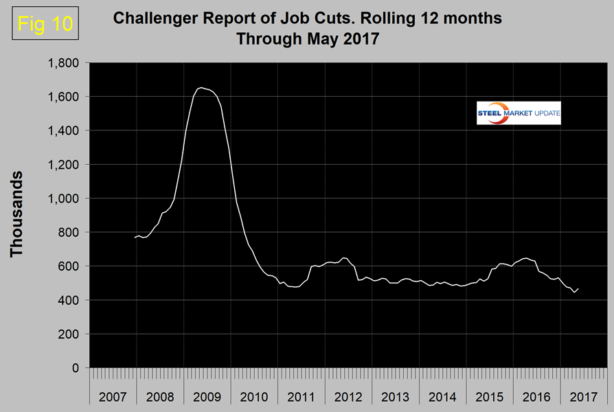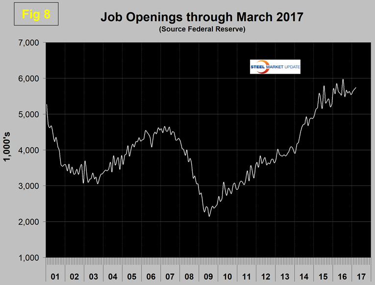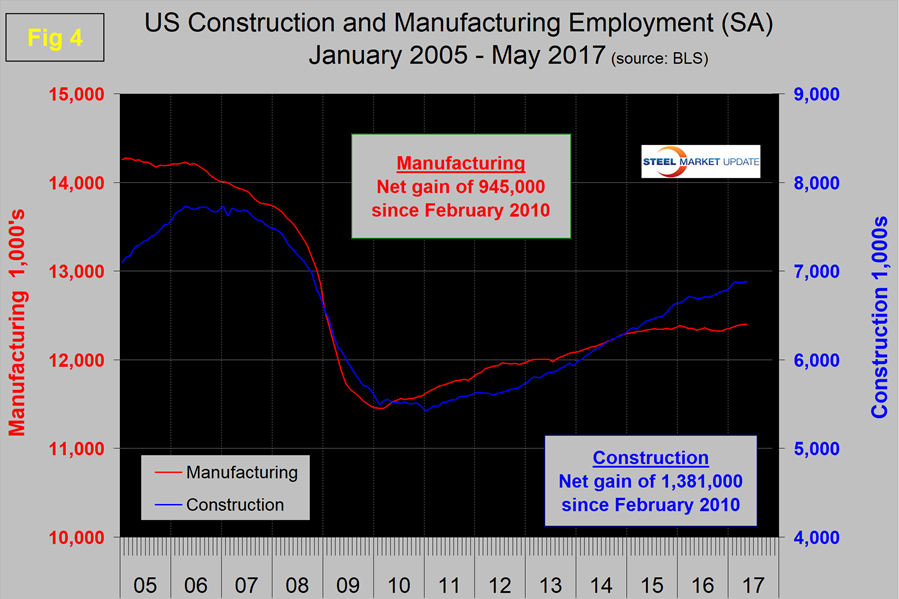 SMU Comment: Overall we think the employment situation is very good and has been described as “full” by some analysts. May was the 78th consecutive month of job growth but Figure 1 shows a slowing trend since the middle of last year. This may not be a sign of a slowing economy but rather a lack of availability of qualified employees. In which case, we can expect an increase in wage driven inflation in the near future. The results for manufacturing and construction are sign posts for steel sales activity. In the big picture, layoffs are historically low and job openings are close to all-time highs therefore 2017 is tracking well.