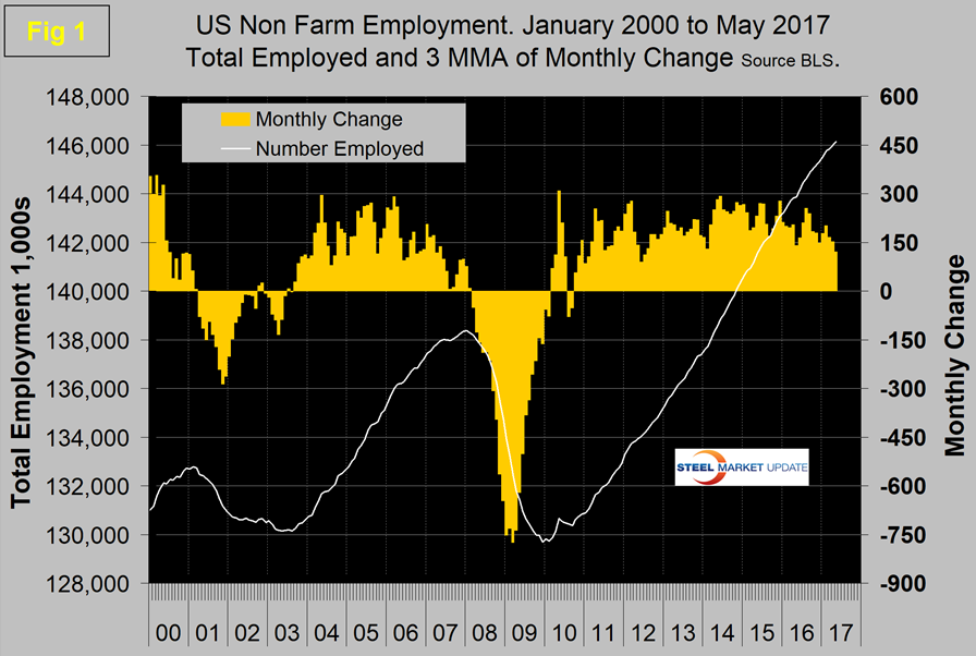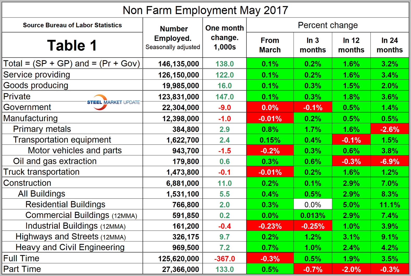In May, manufacturing lost 1,000 positions which was the first decline of the year. So far in 2017 manufacturing has gained 55,000 jobs and is 0.5 percent higher than the same month in 2016. Table 1 shows that primary metals gained 2,900 jobs in May and is up by 9,000 ytd. Transportation equipment including aircraft gained 2,400 jobs in May but motor vehicles lost 1,500 positions. After the recession there was a steady gain in auto manufacturing jobs to 951,600 in August last year. Since then 7,900 jobs have been lost. Trucking was very strong in both February and March but lost ground in April and May. Oil and gas extraction gained 600 jobs in the preliminary May result and is up by 2,700 so far in 2017. Note the subcomponents of both manufacturing and construction shown in Table 1 don’t add up to the total because we have only included those that we think have most relevance to the steel industry.