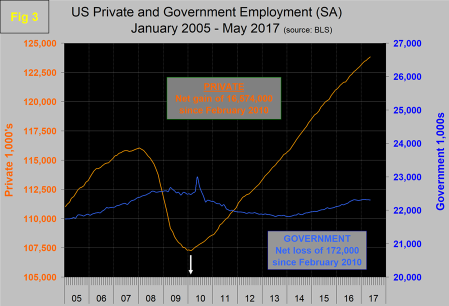 Most of the goods producing employees work in manufacturing and construction and the components of these two sectors that we consider to be of most relevance to steel people are broken out in Table 1. In May, 147,000 jobs were created in the private sector and government lost 9,000. The Federal government gained 8,000 as local governments lost 9,000 and state governments lost 8,000. Since February 2010, the employment low point, private employers have added 16,574,000 jobs as government has shed 172,000 (Figure 3).