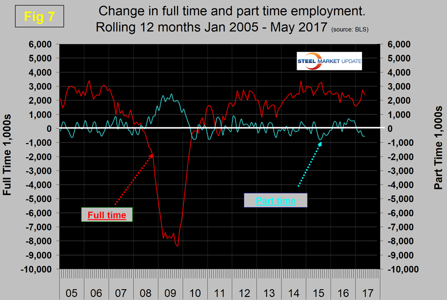 In the 29 months since and including January 2015 there has been an increase of 6,113,000 full time and a loss of 409,000 part time jobs. Figure 7 shows the rolling 12 month total change in both part time and full time employment.