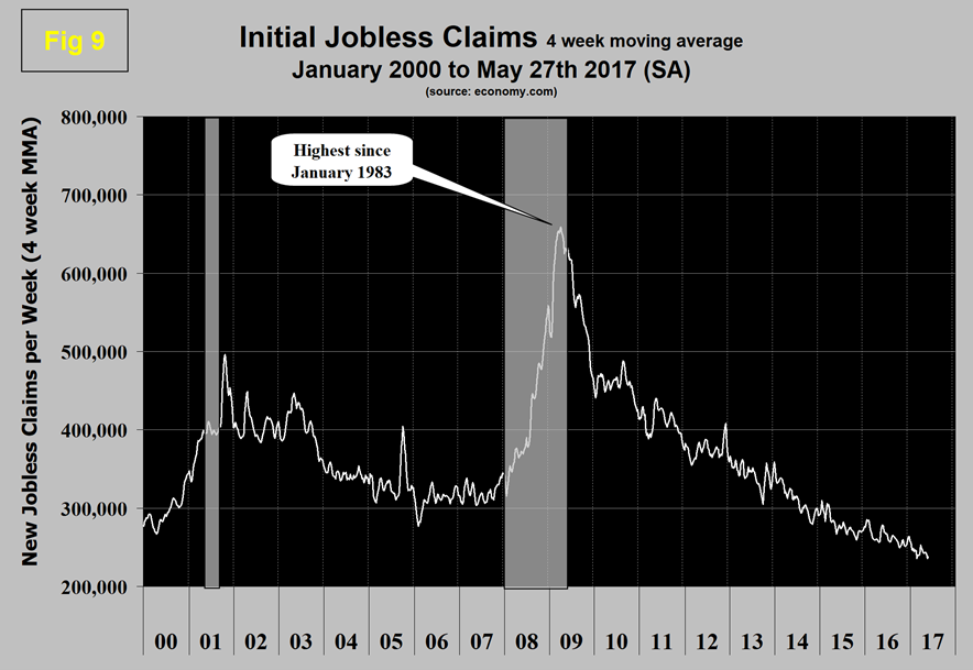 Initial claims for unemployment insurance, reported weekly by the Department of Labor have continued their downward drift this year and in w /e May 27th were 248,000 with a four week moving average of 238,000. This marks the longest streak since 1973 of initial claims below 300,000. (Figure 9). The result for w/e February 4th 2017 at 231,000 was the lowest since March 1973.
