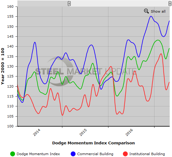 Below is a graph showing the history of the Dodge Momentum Index. You will need to view the graph on our website to use its interactive features, you can do so by clicking here. If you need assistance logging into or navigating the website, please contact our office at 800-432-3475 or info@SteelMarketUpdate.com.