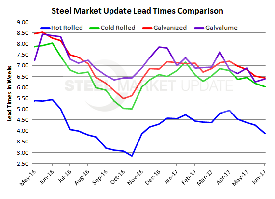Cold rolled lead times also dropped to an average of 6.03 weeks, down from 6.46 weeks in early May and 8.04 weeks a year ago.