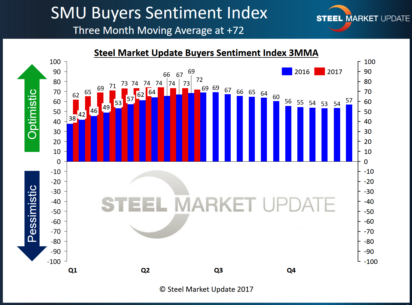 Looking at Current Sentiment as a three-month moving average takes some of the volatility out of the index. As a 3MMA, the index registers +72, showing an even higher level of optimism in today’s steel market. The current 3MMA is down slightly from +74 last month, but up from +69 at this time last year.