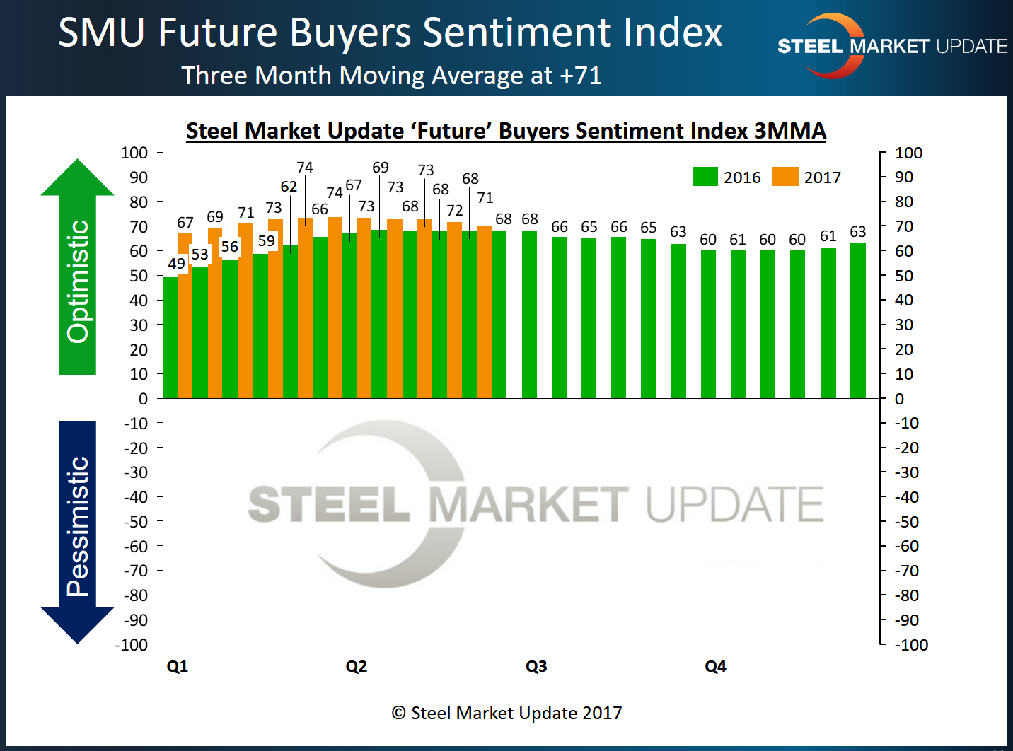 Future Sentiment is how buyers and sellers of flat rolled steel see their company’s chances of being successful three to six months into the future. As a single data point, SMU’s Steel Buyers Future Sentiment Index registers +66, down from +75 a month ago and +69 a year ago. Looking at Future Sentiment as a 3MMA, the index is now at +71, down from +73 last month, but up from +68 last year.