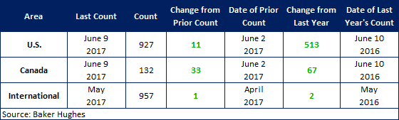 According to Baker Hughes data from June 9, 2017, the US rig count for the week was 927 rigs exploring for or developing oil or natural gas. This is up 11 rigs compared to last week, with oil rigs up 8 to 741 rigs, gas rigs up 3 to 185 rigs, and miscellaneous rigs unchanged at 1 rig. Active US rigs have increased week over week for the past 21 weeks. Compared to this time last year, the 927 count is up 513 rigs, with oil rigs up 414, gas rigs up 100, and miscellaneous rigs unchanged.