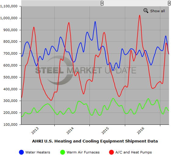 Below is a graph showing the history of water heater, warm air furnace, and air conditioner shipments. You will need to view the graph on our website to use it’s interactive features, you can do so by clicking here. If you need assistance with either logging in or navigating the website, please contact our office at 800-432-3475 or info@SteelMarketUpdate.com.