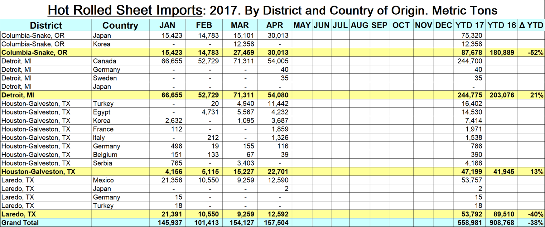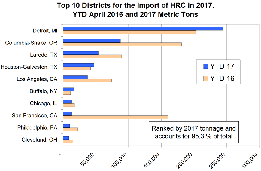 Through April of this year, 558,981 metric tons of HRC entered the country, down by 38 percent from the first four months in 2016. As an illustration of regional differences, San Francisco was down by 92 percent, Detroit was up by 21 percent and Houston was up by 13 percent.