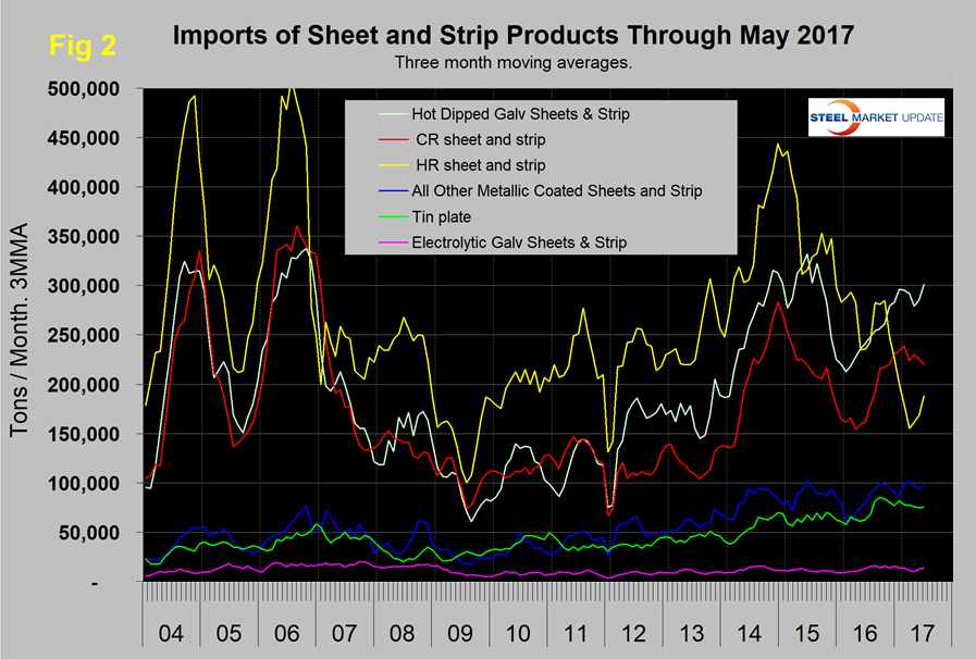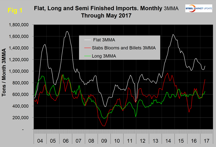 Imports of semi-finished in May totaled 921,664 tons with a 3MMA of 857,718 tons. This was the highest 3MMA since November 2014. “Flat” includes all hot and cold rolled sheet and strip, all coated sheet products and both discrete and coiled plate. The 3MMA of flat rolled imports increased by 63,473 tons from April, after declining for seven straight months since September. Long product imports have been range bound between 519,000 tons and 772,000 tons since May 2014 with no particular trend evident. In May 2017, the 3MMA of long product imports was 652,622 tons.