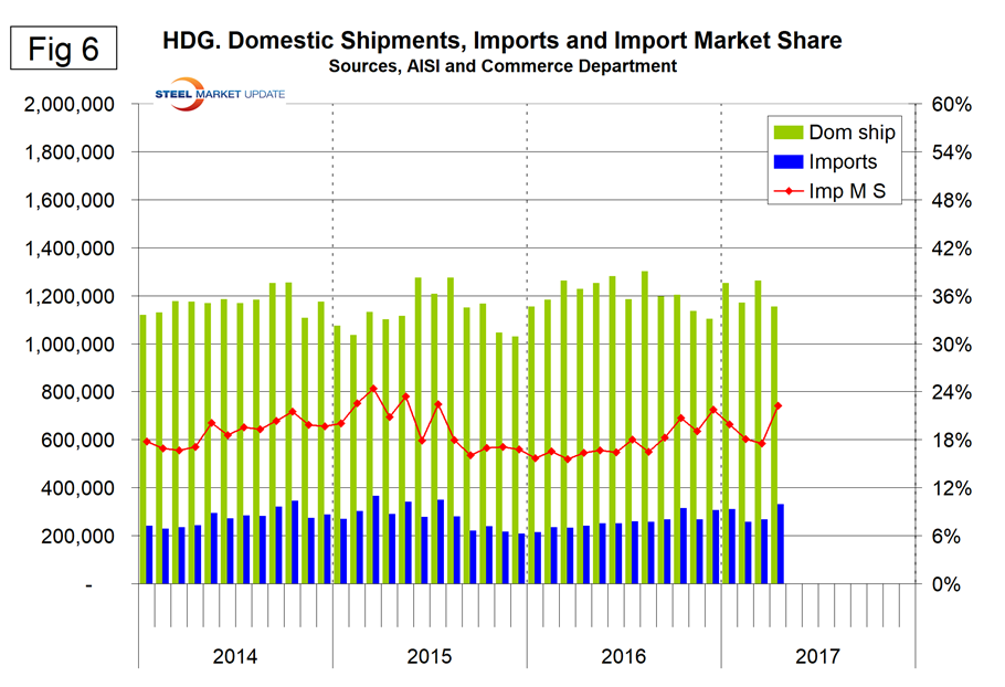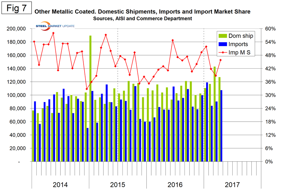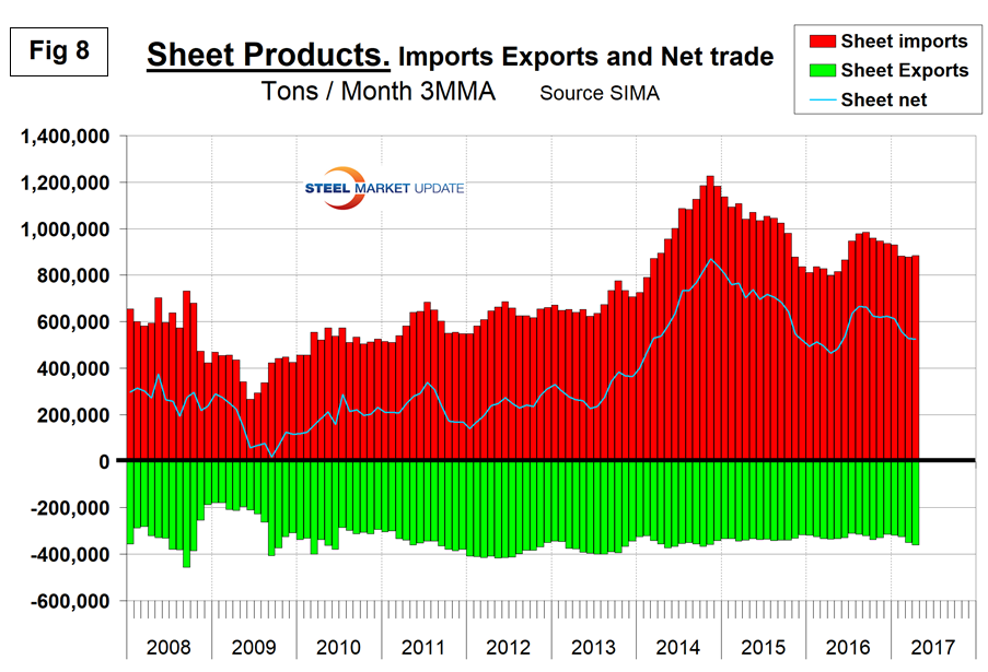 Exports have increased every month since last November, and this has been a major driver of the decline of net imports. Net sheet steel imports are still high by historical standards. If as expected the Fed continues to raise interest rates in 2017, the U.S. dollar will appreciate against the currencies of the steel trading nations. This in turn will put upward pressure on imports and downward pressure on exports for the balance of 2017.