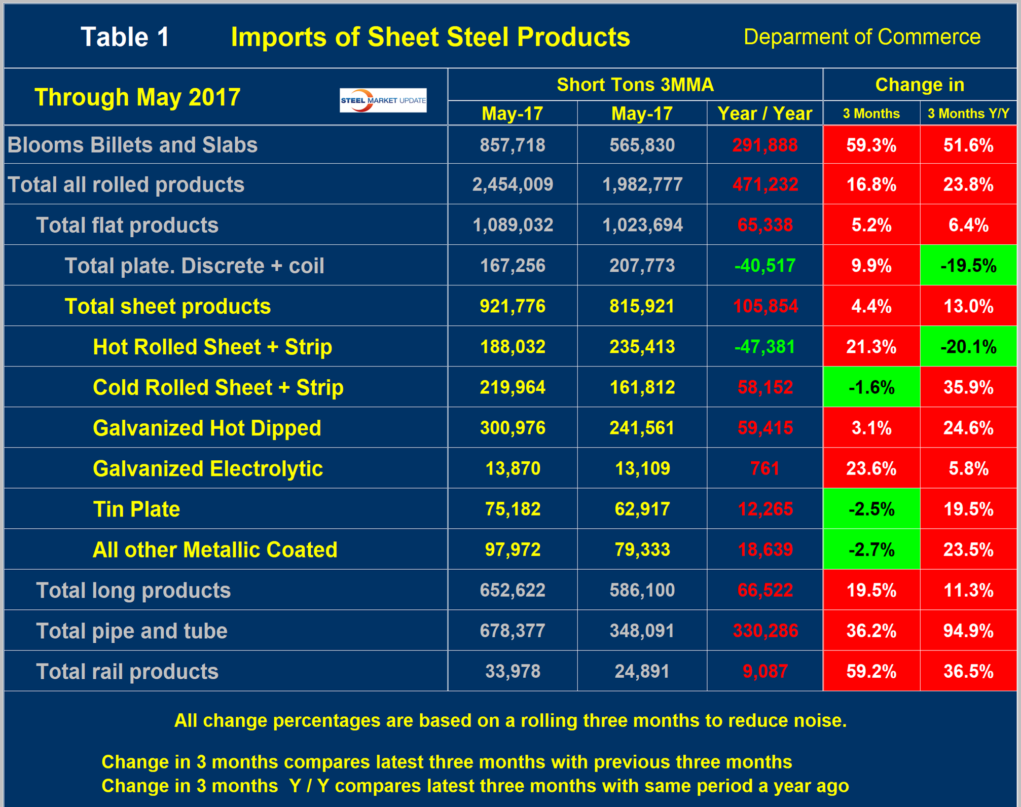 Table 1 provides an analysis of major product groups and of sheet products in detail. It compares the average monthly tonnage in the three months through May 2017 with both three months through February (3M/3M) and the three months through May 2016 (Y/Y).