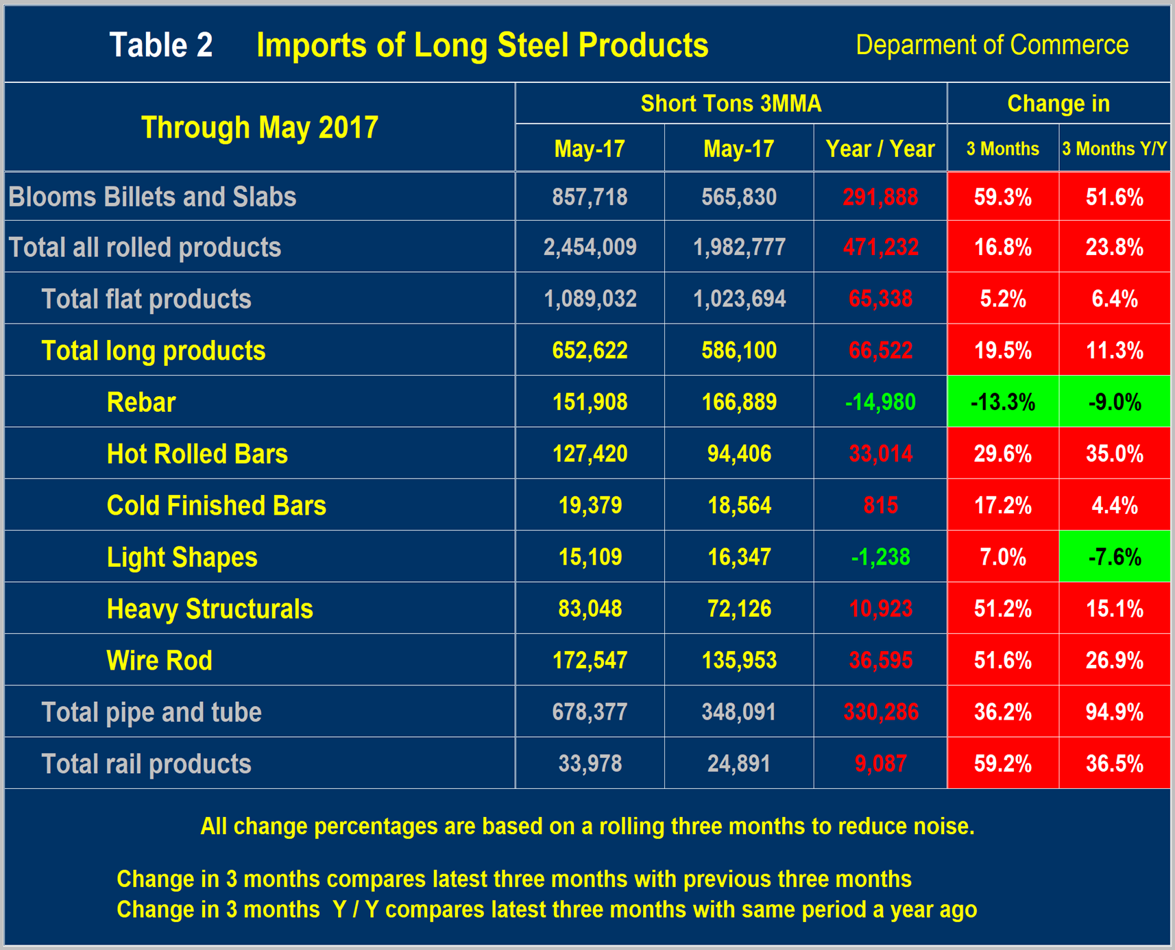 Semi-finished products are up by over 50 percent in both time comparisons. The total of all rolled products rose by 23.8 percent Y/Y. Total sheet products grew by 13.0 percent. Tubulars were up by 94.9 percent and long products were up by 11.3 percent.