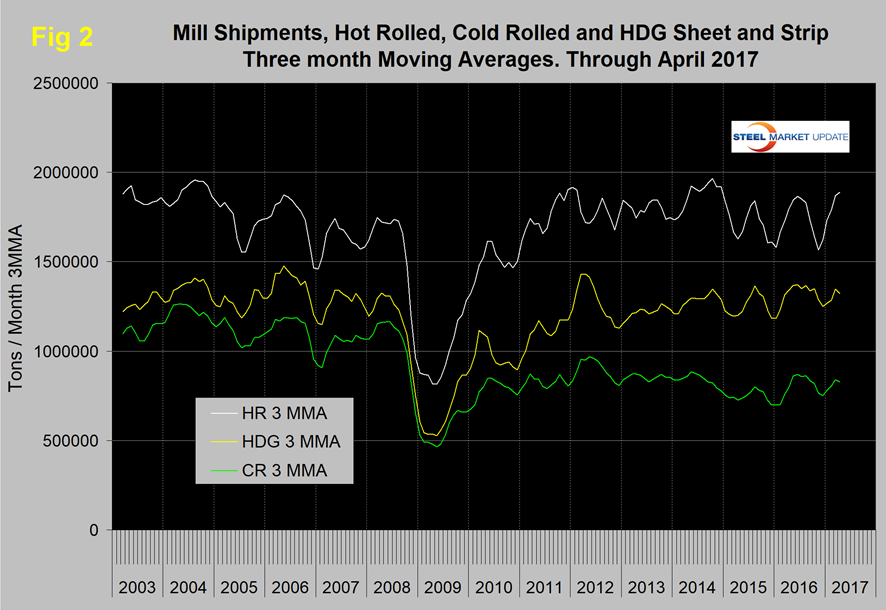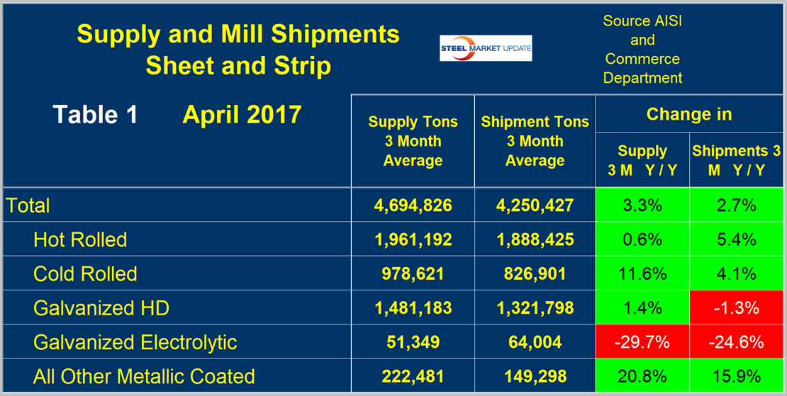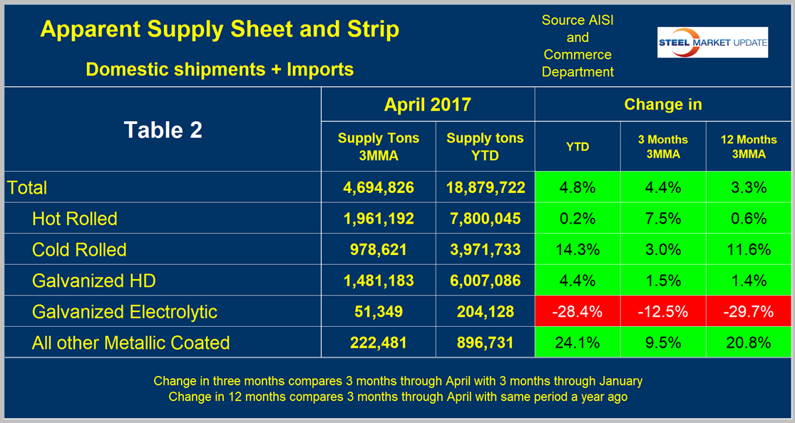 Table 1 describes both apparent supply and mill shipments (including exports) of sheet products side by side as three-month moving averages (3MMA) through April for both 2016 and 2017.