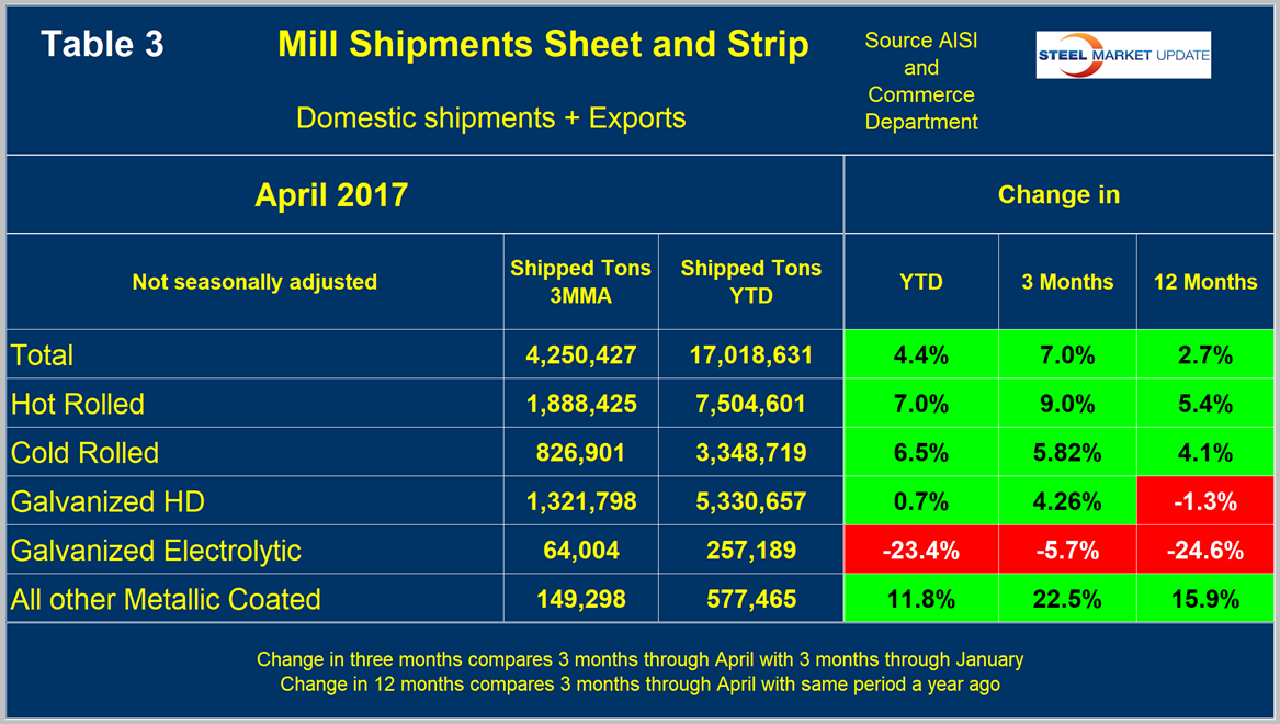 Table 3 shows that total shipments of sheet and strip products including HRC, CRC and other metallic coated (OMC) products were up by 2.7 percent in the three months through April year over year.