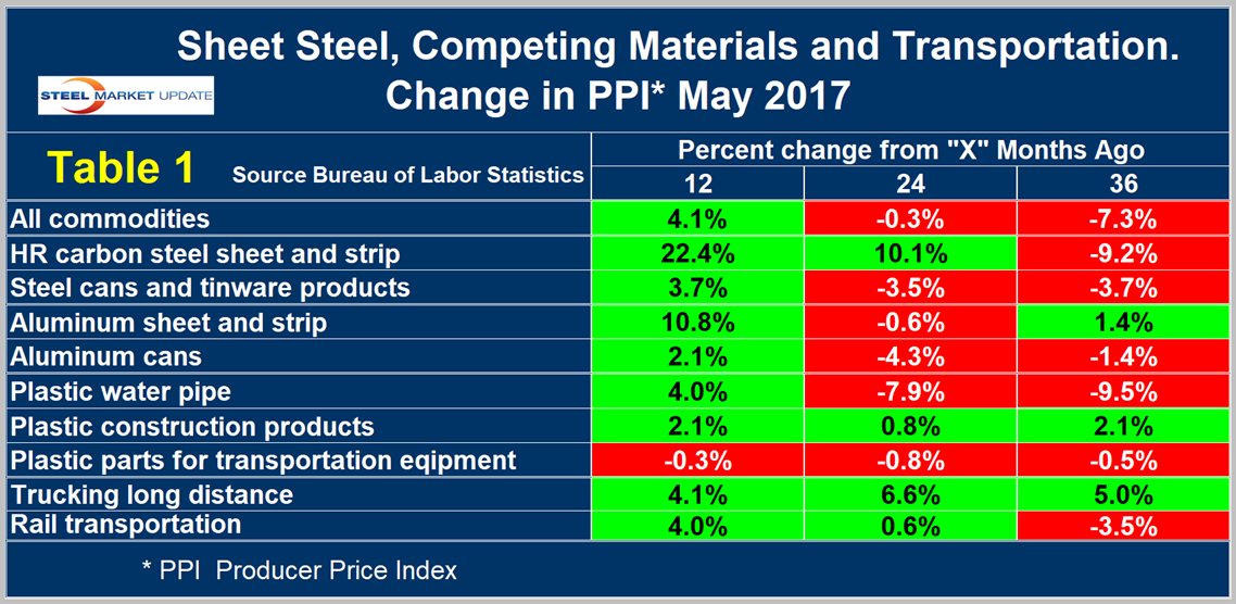 The gain/loss pattern as shown by the color codes in this latest update on a year-over-year basis is much better than in any of our reports since January 2015. Our analysis of the PPI data shows that commodity prices as a whole rose by 4.1 percent in 12 months through May, an improvement from the 7.3 percent decline in 36 months. If as expected the U.S. dollar rises during the balance of the year as the Fed raises interest rates, there will be downward pressure on commodity prices. It is evident from Table 1 that carbon steel sheet increased by much more than aluminum sheet at both the 12-month and 24-month levels, which was a recovery from the greater decline for steel at the 36-month level. The change in the PPI of steel and aluminum cans have been similar in the last 12 and 24 months. One of the items normally reported by the BLS is OCTG, but they have released no data for this commodity since February. Data for plastic pipe is current. We understand that steel dominates in most oil production and refining applications as plastic is used more often in distribution, mostly of natural gas, to end users. The PPI of plastic piping improved in the last year after declining in the previous two years. An analyst of Cleveland-based Freedom Group Inc., told AMM that plastic made significant inroads in oil and gas pipe applications in 2009 through 2012, but since then inroads have slowed. The PPI of plastic construction products and plastic parts for transportation equipment have been much more subdued than for steel in general, as a result of the stagnation in hydrocarbon feedstock prices.