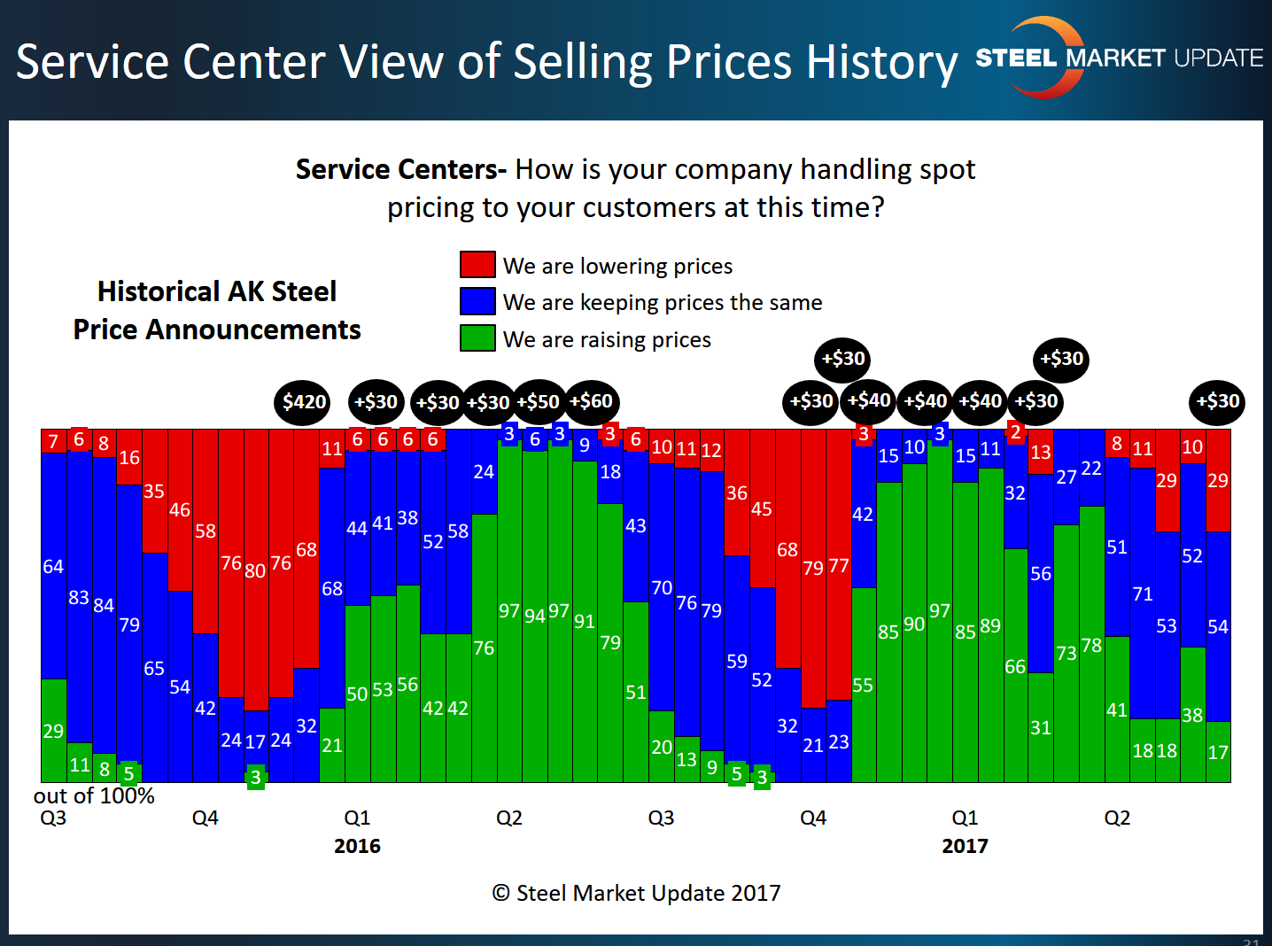 The black ovals at the top of the bars represent AK Steel price announcements going back to the beginning of July 2014. The AK Steel price announcements can be found on their website (www.aksteel.com) under the news tab.