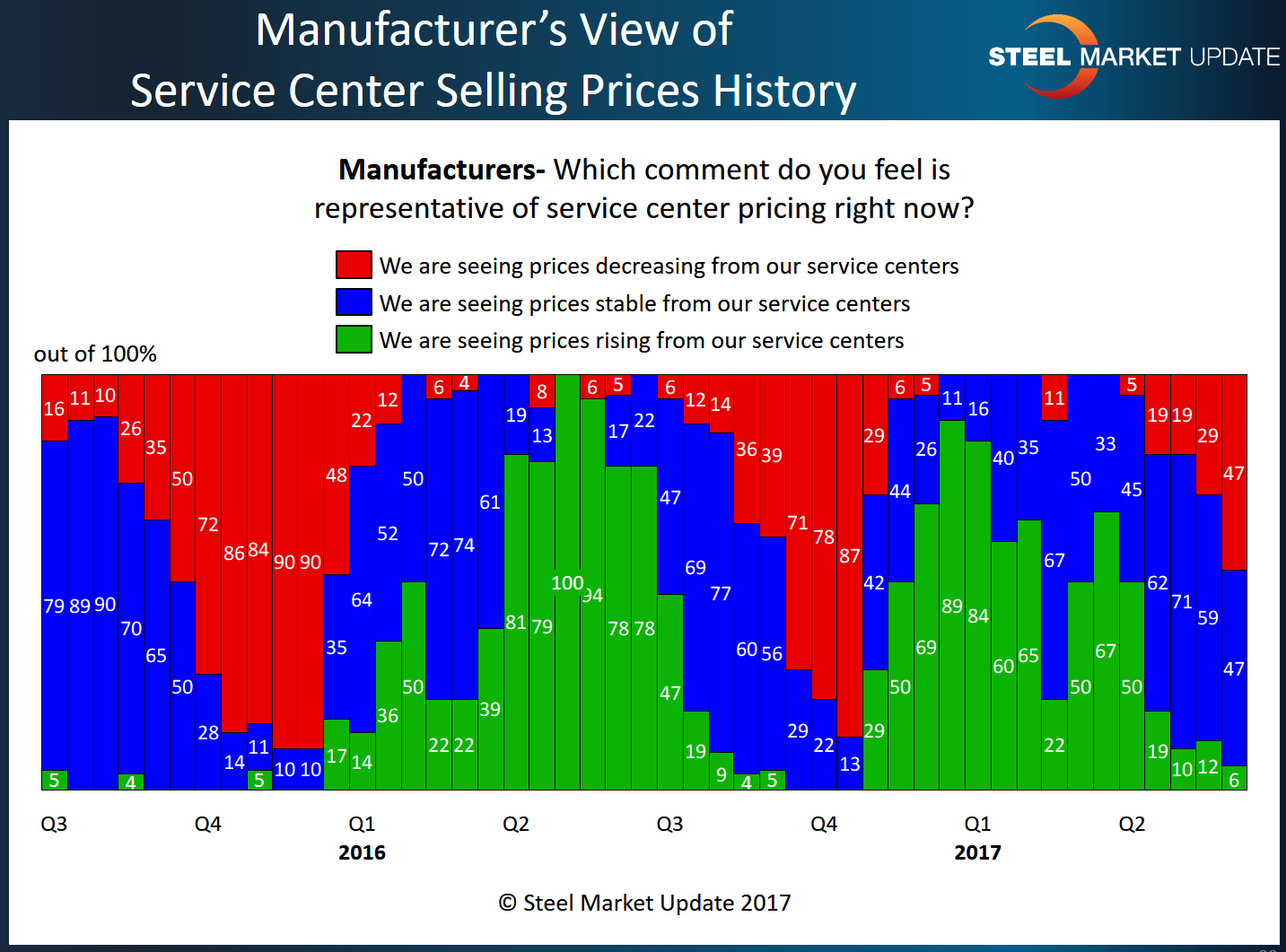 According to the manufacturers who responded to our query on the topic this past week (the week the domestic mills raised flat rolled steel prices), almost half (47 percent) reported distributors lowering spot prices to end users. A total of 6 percent of our respondents replied indicating service centers were raising spot prices.
