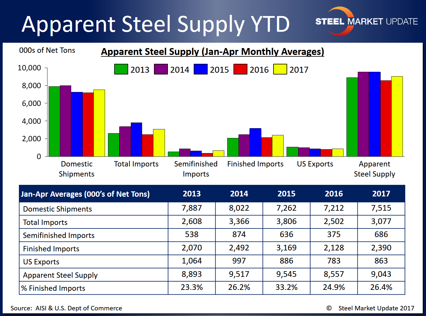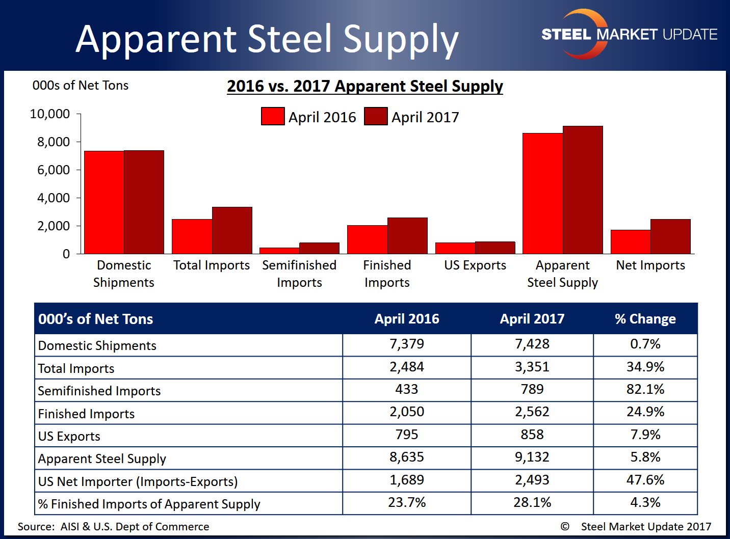 Apparent steel supply for the month of April totaled 9,132,068 net tons, according to the latest data released from the U.S. Department of Commerce and the American Iron and Steel Institute. Apparent steel supply is calculated by adding domestic steel shipments and finished U.S. steel imports, then subtracting total U.S. steel exports.