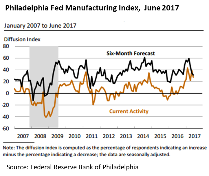 Manufacturers in the Philadelphia area saw manufacturing slow in June. The headline index fell to 27.6 from 38.8 in May. The index, however, continued 11 consecutive positive months. Economists were expecting the drop after the May index reached its second highest reading in more than 30 years.