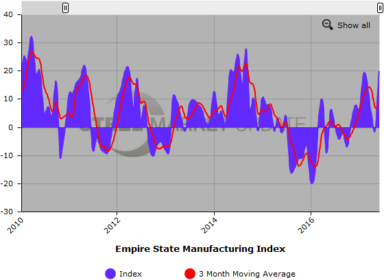 Below is a graph showing the history of the Empire State Manufacturing Index. You will need to view the graph on our website to use its interactive features, you can do so by clicking here. If you need assistance logging into or navigating the website, please contact our office at 800-432-3475 or info@SteelMarketUpdate.com.