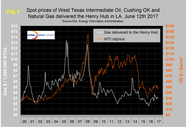 Figure 1 shows historical oil and gas prices since January 2000. On June 6 last year, the daily spot price of West Texas Intermediate (WTI) rose through $50 for the first time since July 21, 2015. Since June 2016, the price has ranged between a low of $40.05 in August last year and a high of $54.00 in February this year. WTI spot on June 12 this year was $46.10. In other words, the price has gone nowhere in over a year. Data source is the EIA.