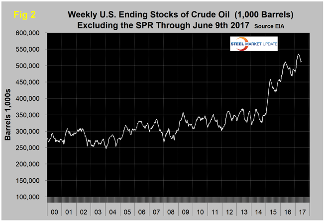 Weekly U.S. stocks of crude oil, excluding the strategic petroleum reserve, declined for eight consecutive weeks through May 26, bounced back in the week ending June 2 and declined again on June 9 (Figure 2). However, stocks are still historically high. EIA’s April 2017 Short-Term Energy Outlook (STEO) expects that electricity generation fueled by natural gas this summer (June, July and August) will be lower than last summer, but it will continue to exceed that of any other fuel, including coal-fired generation, for the third summer in a row. The projected share of total U.S. generation for natural gas is expected to average 34 percent, which is down from 37 percent last summer, but still exceeds coal’s generation share of 32 percent.