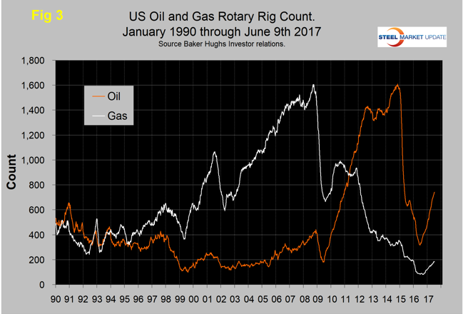 The total number of operating rigs in the U.S. on June 9 was 927, and has risen steadily since its low point of 404 on June 27, 2016. The oil rig count hit a low point of 316 also on June 27 last year and has since risen to 741 on June 9. The U.S. gas rig count has risen from its low point of 81 on August 5 last year to 185 on June 12. The year-on-year growth rate of U.S. plus Canadian total rigs was 121 percent in the latest data. Figure 3 shows the Baker Hughes Rotary Rig Counts for oil and gas equipment in the U.S. (Explanation below).