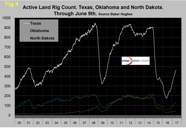 On a regional basis in the U.S., the big three states for operating rigs are Texas, Oklahoma and North Dakota. Figure 4 shows the land rig count in those states since 2000 and that non-conventional drilling in North Dakota has declined by 75 percent from its heyday in late 2014. This is not as bad as it sounds because previously drilled and capped wells are being put back on stream. The Dakota Access Pipeline is open for business. Bakken oil producers now have the ability to ship 520,000 barrels per day by pipeline rather than by rail to the hub near Patoka, Ill., where refiners in the Midwest can access the crude. An additional option is to ship to the hub near Nederland, Texas. According to The Hellenic Shipping News, “A producer in the Williston Basin, who did not wish to be identified, said on Thursday that the start-up of Dakota Access will result in higher netbacks. In 2014, the company had to sell its crude oil at a discount of about $9.60/b to WTI; today its $2.96/b.” Prices in the Bakken may improve even more once refiners get used to using its higher quality.
