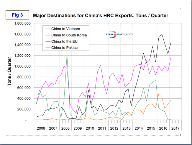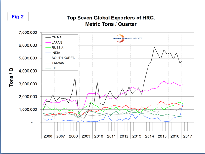 Figure 2 shows the relative size of China as an exporter, but also that Japan is exporting well over half as much as China. The most significant change in Q1 2017 was that India increased its volume by 91 percent compared to Q4 2016 and moved into fourth place. China exported 20.4 million metric tons of HRC in 2016, but its tonnage has been contracting since Q4 2014. China’s annual rate in Q1 2017 was 19.1 million tons.