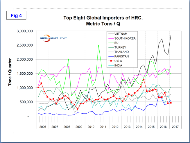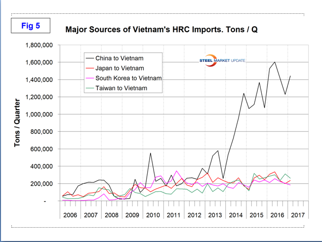Figure 4 shows the top eight importing nations through Q1 2017. In the first quarter, the U.S. was in seventh place. Vietnam has by far the highest volume of any importing nation, which on the face of it seems impossible as its annualized import rate of HRC in Q1 2017 was 11.4 million tons. We assume that this must be the further processing and re-export of Chinese coil. In Figure 5 we see the startling increase in tonnage shipped from China to Vietnam since Q4 2013. Vietnam’s other sources have been relatively unchanged. It is evident that the U.S. is not (as has been frequently claimed) the most porous import market in the world. The EU was in third place for total HRC imports in Q1 in spite of shutting out China.
