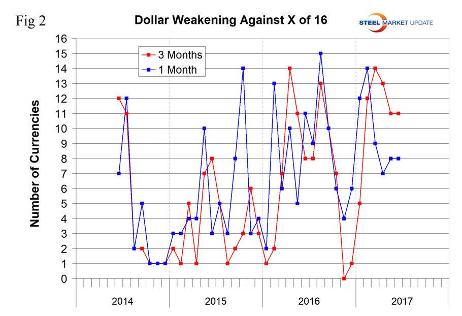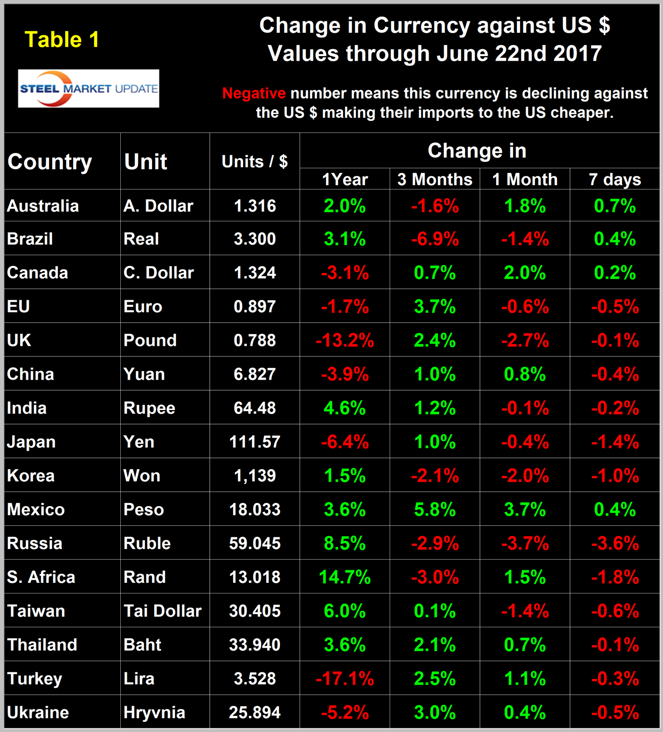This shows that since our last update on May 23 the currency market has been quiet, at least in terms of the steel trading nations. In both May and June, the dollar weakened against 8 of the 16 in one month and against 11 of the 16 in three months. Table 1 is color coded to indicate strengthening of the dollar in red and weakening in green. We regard strengthening of the U.S. dollar as negative and weakening as positive because of the effect on the trade balance of all commodities and also of the total national trade deficit.