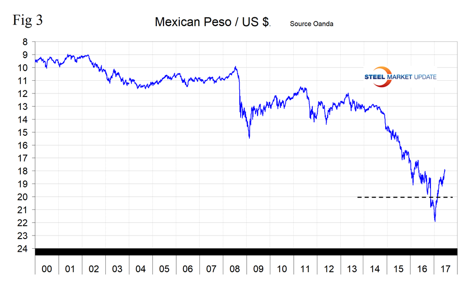 The Mexican Peso has strengthened against the U.S. dollar by 5.8 percent in three months, by 3.7 percent in 30 days and by an astonishing 21 percent since January 11 (Figure 3).