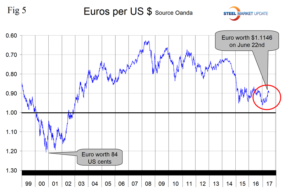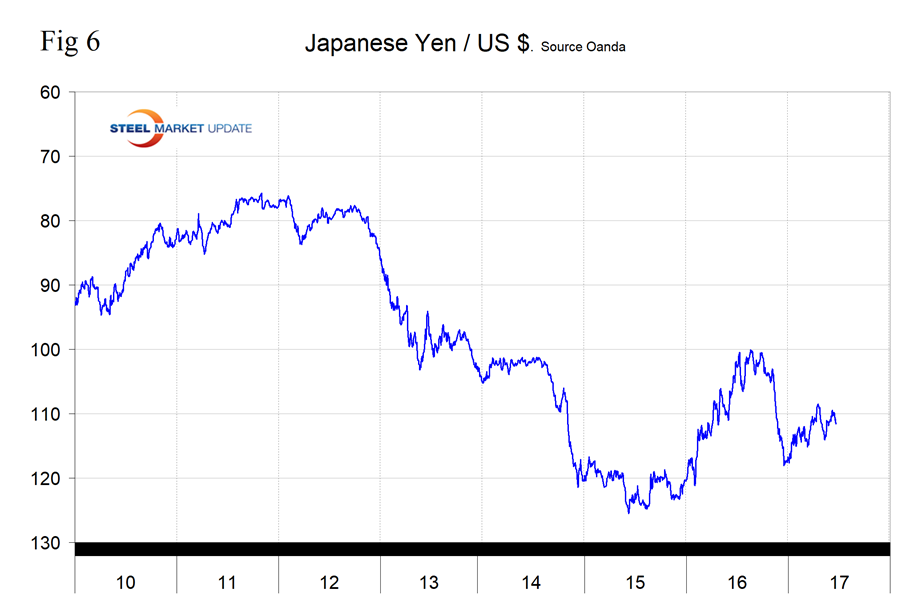 The Euro: On June 22, the Euro was worth 1.1146 U.S. dollars. It has appreciated by 3.7 percent in the last three months and had depreciated by 0.6 percent in 30 days. There has been an accelerating appreciation in the course of 2017 (Figure 5).