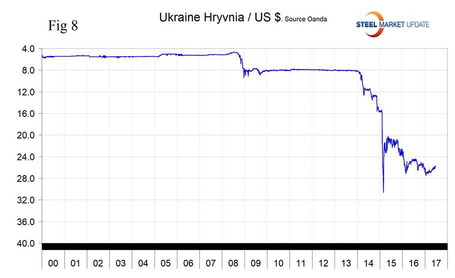 The Ukrainian Hryvnia: As with Korea, we never see anything published about this currency either, but it is included in Table 1 because Ukraine is a serious player in the global steel market. As an importer of steel to the U.S., Ukraine is currently in 17th place. As a global exporter of HRC, Ukraine is in 7th place after China, Japan, South Korea, Russia, Taiwan and the EU, in that order. On June 22, it took 25.89 Hryvnias to buy one U.S. dollar. The Hryvnia has appreciated by 3.0 percent in the last three months (Figure 8).