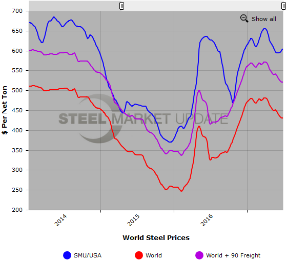 Below is a graph comparing SteelBenchmarker world HR export prices against the SMU domestic HR average price (we will build new data using Platts and replace the SteelBenchmarker data once we have collected a sizable history). We also have included a comparison with freight and traders’ costs added, which gives you a better indication of the true price spread. You will need to view the graph on our website to use its interactive features; you can do so by clicking here. If you need assistance with either logging in or navigating the website, please contact us at 800-432-3475 or info@SteelMarketUpdate.com.